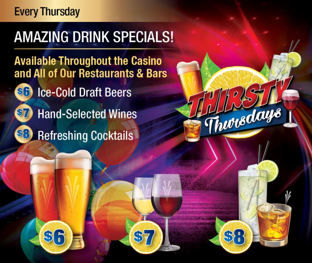 Acompáñanos en el Valley View Casino & Hotel en nuestra promoción Thirsty Thursdays, donde podrás saborear cervezas de barril heladas a $6, vinos seleccionados a mano a $7 y refrescantes cócteles a $8.