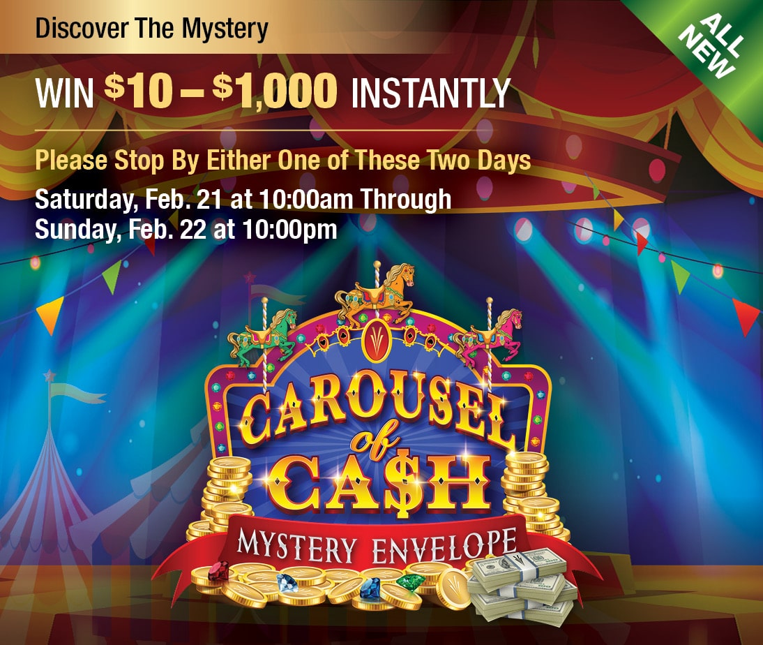 Are you ready to discover your prize? Invited guests will bring in their unopened Mystery Envelope on March 21 or March 22 to reveal a prize of $10 – $1,000. To learn more about or Mystery Envelope promotion and to find out how you can participate, please visit our Players Club.