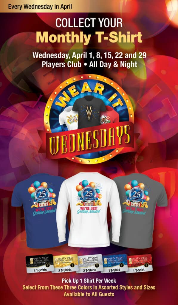 Please join us on Wednesdays in April to receive a free Valley View Casino T-shirt available in assorted colors and sizes.